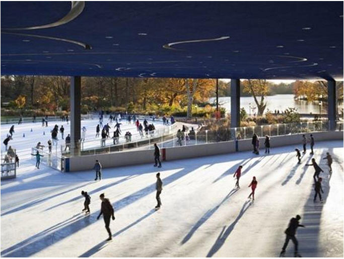 Trung tâm LeFrak mới trong công viên Prospect tại Brooklyn không chỉ có diện tích khổng lồ hơn 105.000 m2 mà còn có thêm khu giải trí, trượt băng quanh năm rộng gần 7.000 m2 gần hồ. (Tod Williams Billie Tsien Architects).