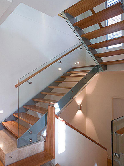 Dùng cầu thang như một điểm nhấn trung tâm với vị trí nằm ngay giữa nhà bằng các đường lượn kết hợp giữa sắt và gỗ như một sắp đặt có đường nét mềm mại. Tất cả các góc nhìn đều xuyên qua cầu thang, ngay cả góc nhìn dưới lên hoặc trên xuống, tạo sự đẹp mắt.