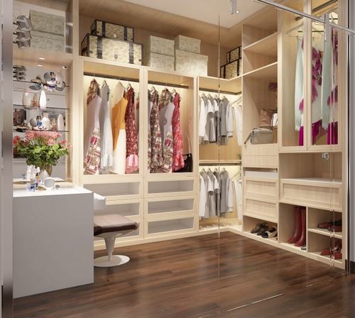 Phòng thay đồ kết hợp là tủ quần áo với bố trí ngăn tủ hợp lý tiện lợi cho viêc chọn quần áo và phụ kiện.