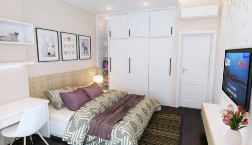 Phòng ngủ master với tông xanh và hồng ngọt ngào, đem đến cảm giác thư thái, bình an cho gia chủ. Giấy dán tường hoa văn phớt hồng trẻ trung, đồng thời là mảng nhấn giúp không gian thêm sinh động..jpg)