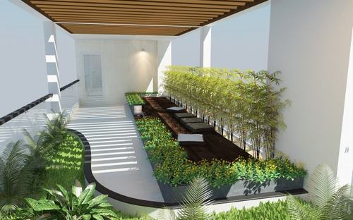 Sân thượng trồng nhiều cây xanh là không gian lý tưởng cho cả gia đình ngắm cảnh và tổ chức những buổi tiêc nhỏ cùng bạn bè vào dịp cuối tuần.