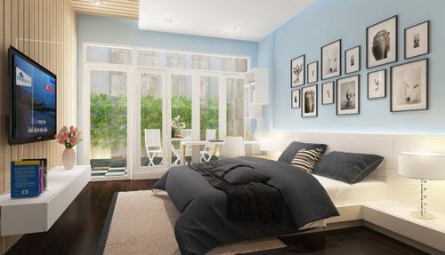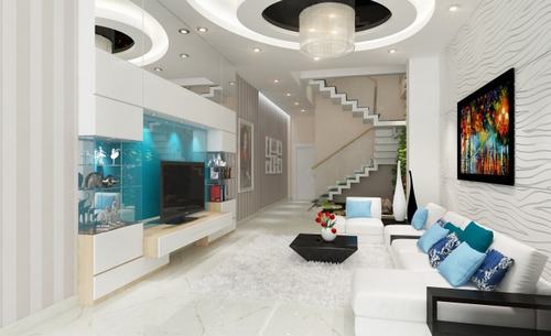 Sau đây là ảnh phối cảnh 3D: Toàn bộ phòng khách với tông trắng sáng phong cách hiện đại, mang lại cảm giác rộng thoáng. Mảng nhấn màu xanh giúp không gian mát mẻ và ấn tượng