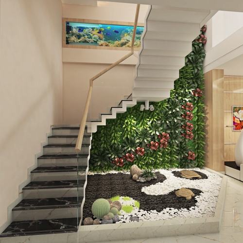 Khu vực cầu thang với tiểu cảnh xanh mát đem thiên nhiên vào nhà.