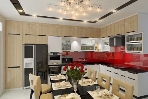 Phòng ăn và bếp tích hợp với điểm nhấn tông màu đỏ ấm cúng. Ánh sáng vàng tăng thêm vẻ ấm áp cho những bữa cơm thân mật. Sự phối hợp nhiều mảng vật liệu khác nhau trên cùng tông màu mang đến vẻ dịu dàng và thanh thoát hơn cho không gian.