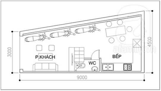 Để không gian phần sau nhà không bị bí, chúng tôi đưa ra giải pháp tạo một giếng trời ở cuối khu đất tại vị trí bị vát chéo của mảnh đất. Thiết kế này sẽ giúp cho phòng ngủ được vuông vắn đồng thời cung cấp cung ánh sáng và thông gió cho nhà vệ sinh. Tầng tum, phía mặt tiền nhà là khu vực dựng tượng quan âm, phía sau là sân phơi.