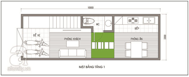 Tại tầng 1, dành diện tích cho khu vực để xe đồng nghĩa với diện tích sinh hoạt dành cho khách – bếp và phòng ăn sẽ khá nhỏ. Chúng tôi đề xuất bố trí một không gian để xe nhỏ ở phía trước nhà. Cầu tầng 1 nhỏ, dưới cầu thang sẽ là nhà vệ sinh cho khách. Để điều hòa không khí và có thêm sáng cho ngôi nhà thiếu mặt thoáng, một phần diện tích tầng 1 sẽ được sử dụng làm khoảng vườn nhỏ trong nhà, thẳng lên là không gian thông tầng. Bếp và phòng ăn bố trí phía trong khu đất, tiếp giáp với vườn.