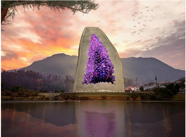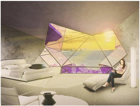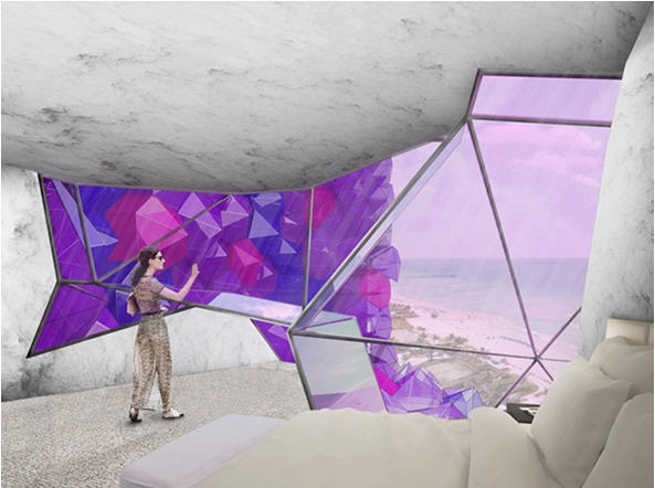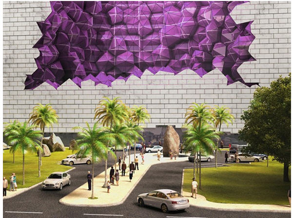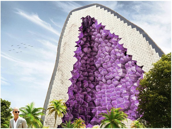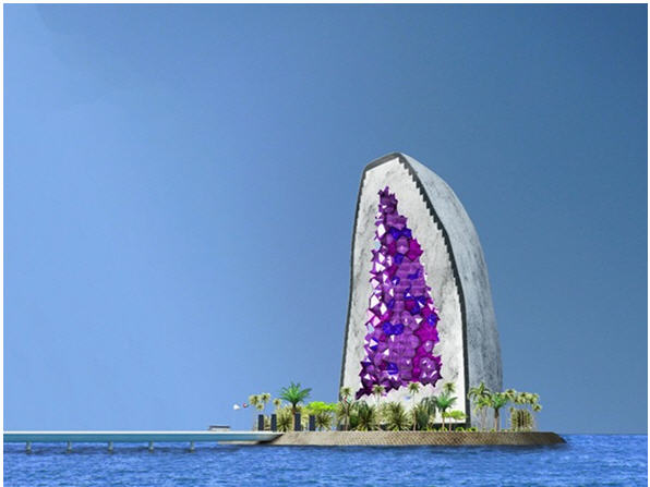 Shaped like the twin fins are cut , revealing part purple sparkle surface , this unique hotel will be built on artificial islands Ocean Flower .