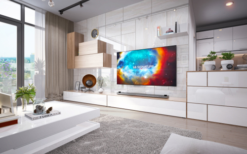 At the same time, the living room space is more harmonious with the LG Oled 7W TV hanging on the marble cut into luxurious patterns and bluetooth soundbar.