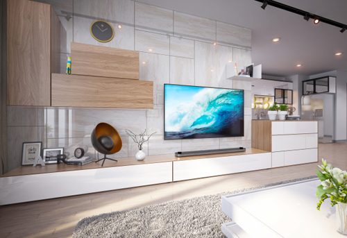 The design also addresses the living room space that matches the size of a 77-inch TV screen, allowing family members to watch television programs or listen to music on the speakers with sound effects. 360 degree arch.