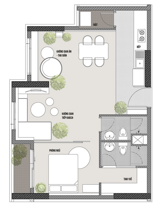 In addition to the bright, neutral colors, the apartment also has a few different green colors to add lively.