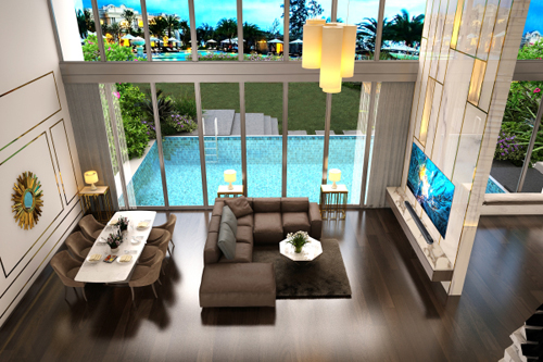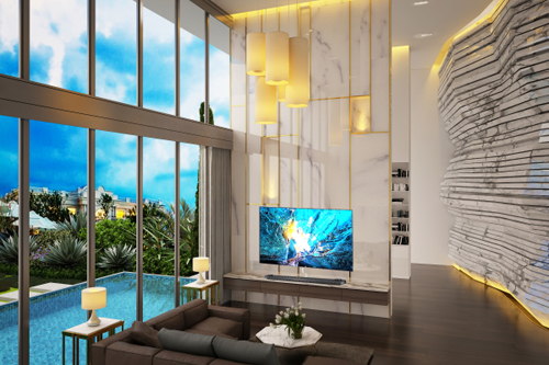 One of the top design elements of the upstream is that the ceiling height is maximized to make space more airy and luxurious. The living room with two surfaces of marble and gold-plated materials are the main highlight, embellishing the luxury of a perfect space.