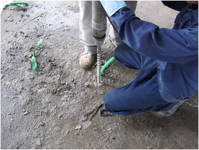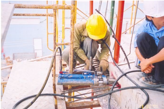 Once finished, the cable tension begin grouting , cement grouting to include mixed with some kind of additives, including additives mainly swelling . You can clearly see his image capture, mortar pump head and filled up on the other end , after seeing mortar spills on the other side , people use plastic bags inserted plug hole closed , so their cable bundles I was pumped full of grout and know.