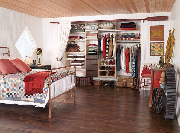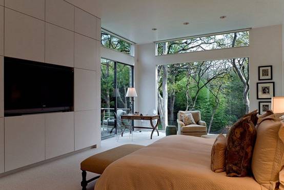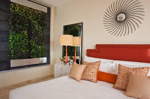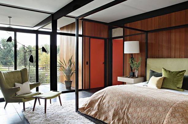 A combination of nothing more perfect dark orange in color between the door with furniture many shapes and modern . Bedroom become more modern and airy thanks to the balance of quilt patterns as well as the large door , bring nature into your living space .