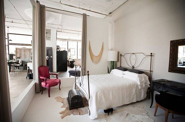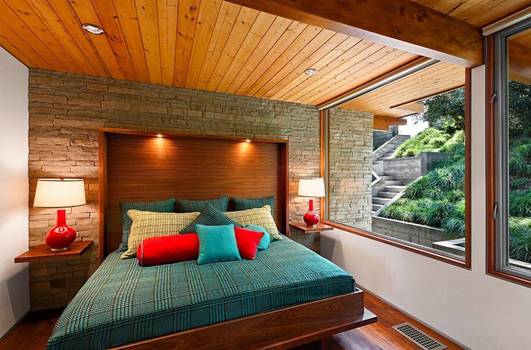 Retro style of the 60s once again came back with the addition of simple motifs and green colors of the bedcover , besides bare brick walls and rustic style modern furniture makes the room add a lot closer . System wide windows of the room and out into the garden next to extremely comfortable.