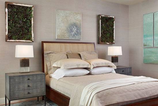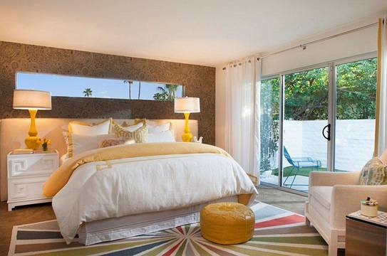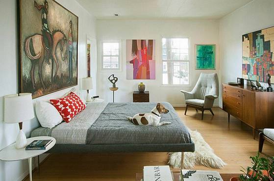 Style characteristic of modern interior design that's Mid- century bed with absolutely simple design , large size bed plus abstract paintings contributed to room extra special .