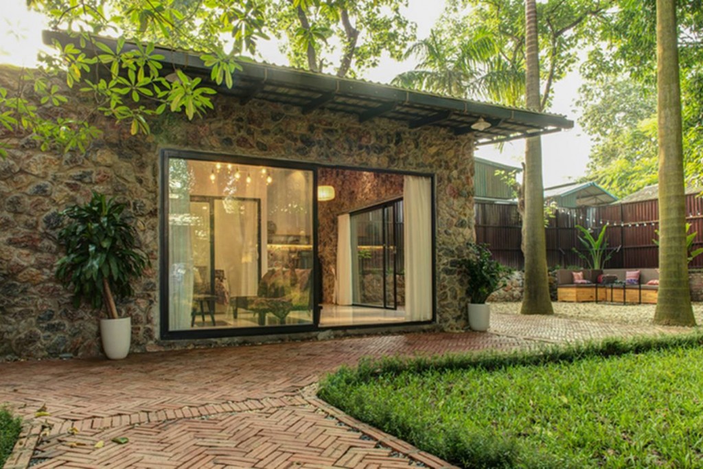 Tường nhà được xây bằng đá, mái lợp ngói kết hợp với các vật liệu hiện đại như kính, gạch men trắng...