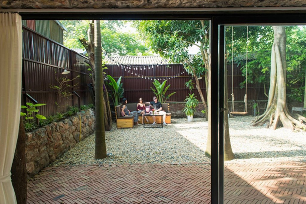 Để giữ lại gốc cây lớn ở góc vườn, đội thiết kế Chu Văn Đông, Nguyễn Anh Tuấn, Nguyễn Thanh Tâm (Handyman Decor) để cây xiên qua mái và xử lý chống dột bằng keo cùng một vài thủ thuật khác.