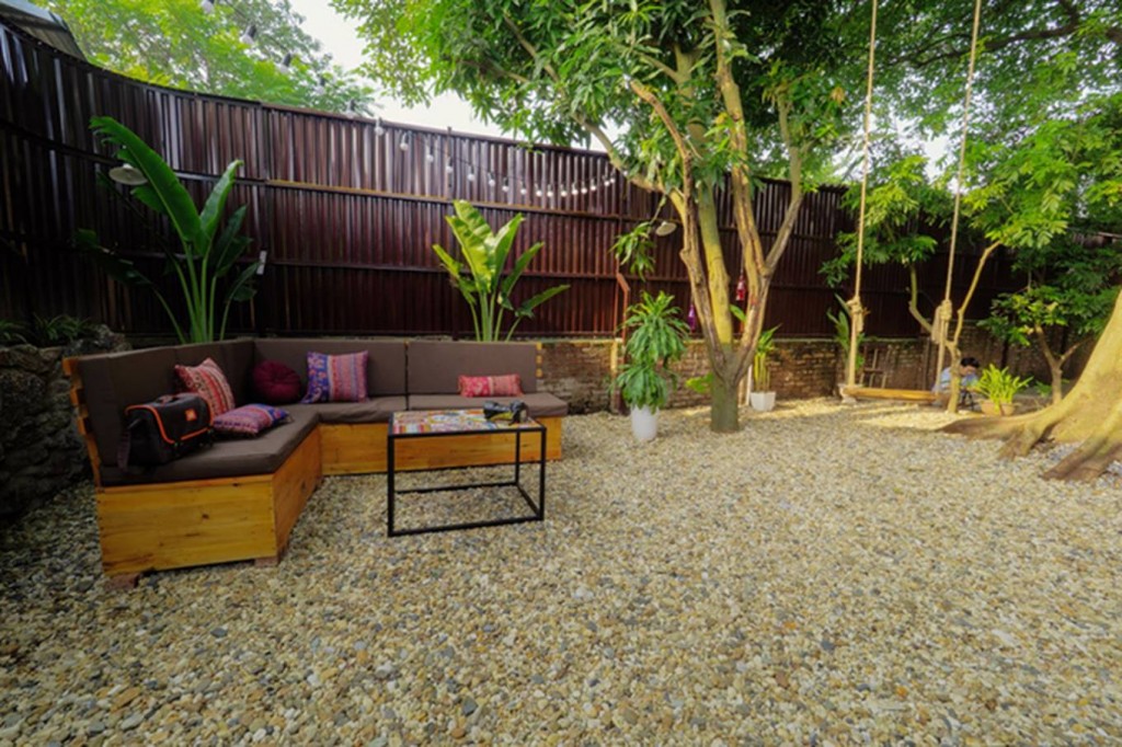 Một góc sân ngoài trời bố trí khu thư giãn với bàn ghế, xích đu. Sân rải sỏi giúp chủ nhà như được massage khi đi chân không.