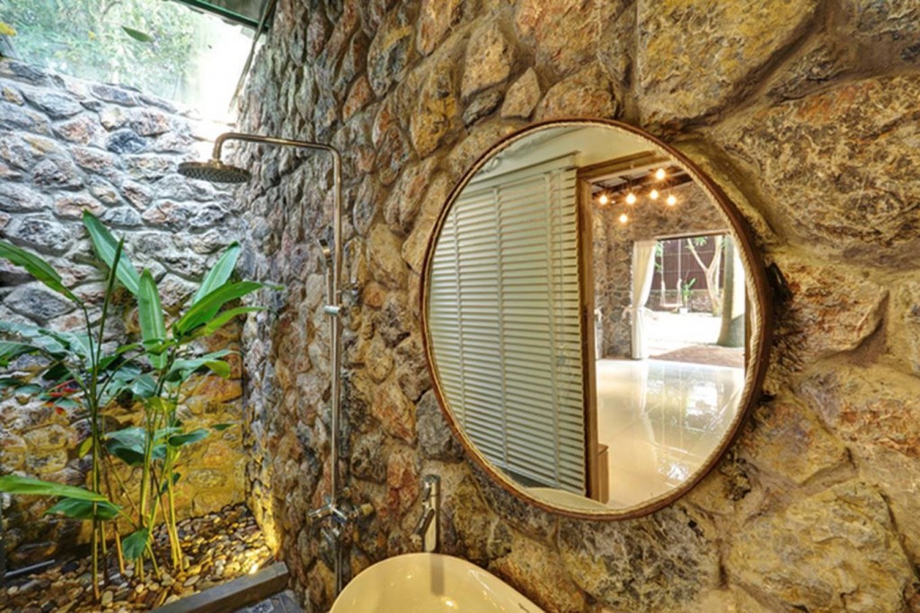 Lối đi quanh nhà lát gạch mộc, bờ tường được ốp đá, trồng những cây thiên điểu gợi nhớ hình ảnh của núi rừng.